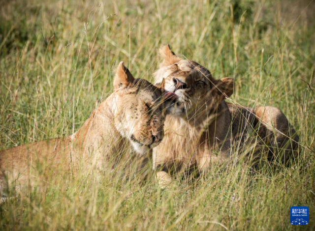 9月7日,在肯尼亞馬賽馬拉國家保護區,一頭獅子為同伴舔毛。