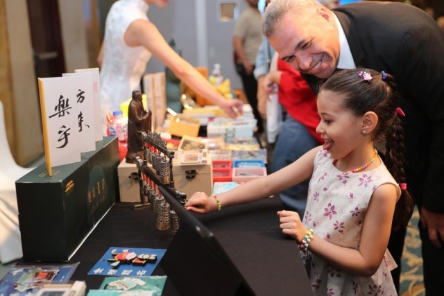 6月12日,一名女孩在埃及開羅舉辦的“茶和天下”尼羅雅集活動現場體驗“遇見孔子”非遺文創產品。新華社記者 隋先凱 攝