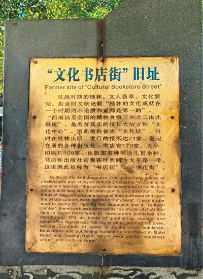 位于桂林市中心的解放西街,一座“文化書店街”舊址紀念碑在街角靜靜矗立??箲饡r期,這條街道曾有過另一個名字:桂西路。