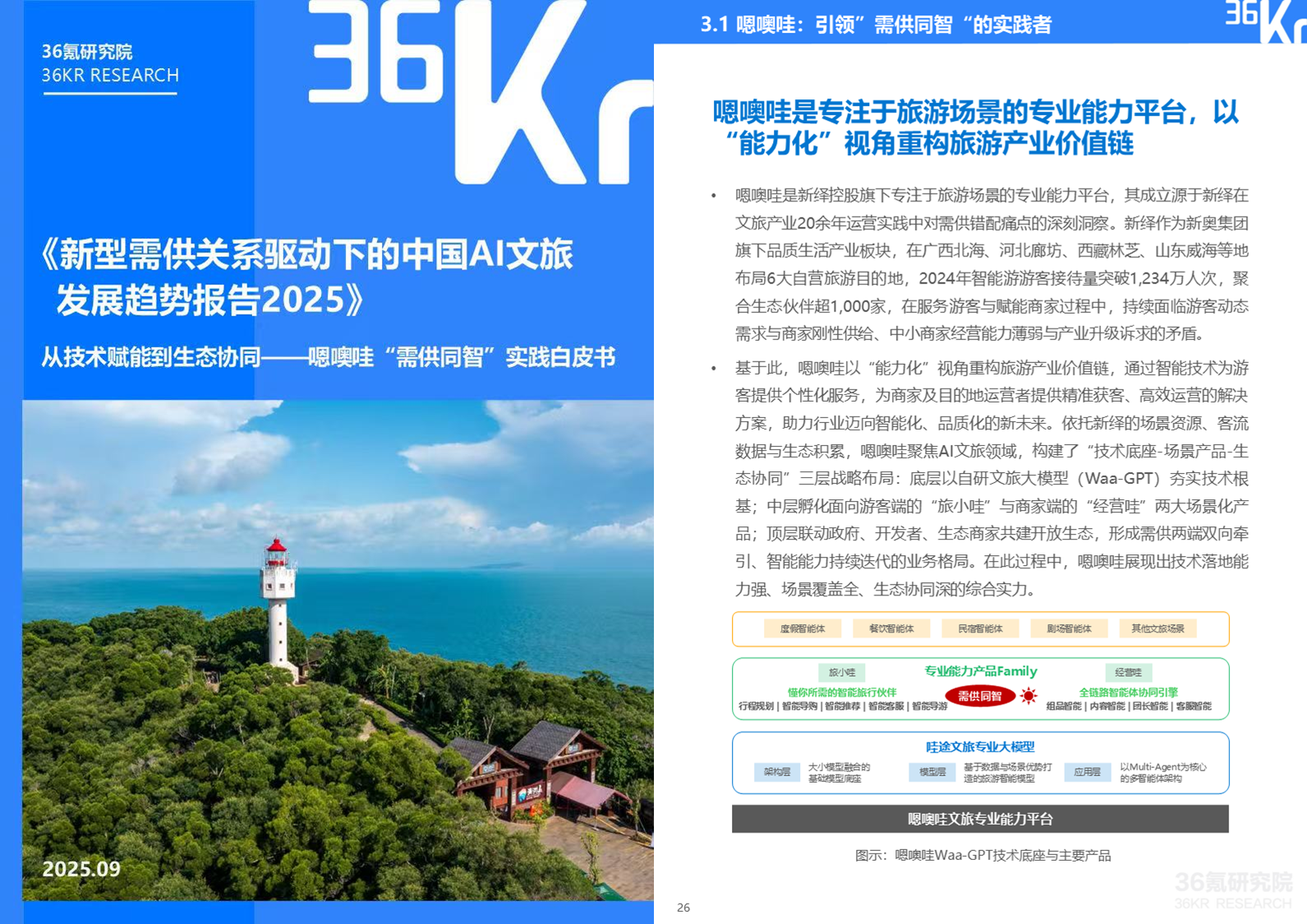 大賽期間,36kr研究院發布了《新型需供關系驅動下的中國AI文旅發展趨勢報告2025》白皮書。白皮書重點解讀了嗯噢哇“需供同智”的生動實踐,詮釋了以AI技術破解文旅行業“需供錯配”難題的創新路徑。報告認為,嗯噢哇通過AI推動需求側與供給側協同,為產業高質量發展提供了重要參考。