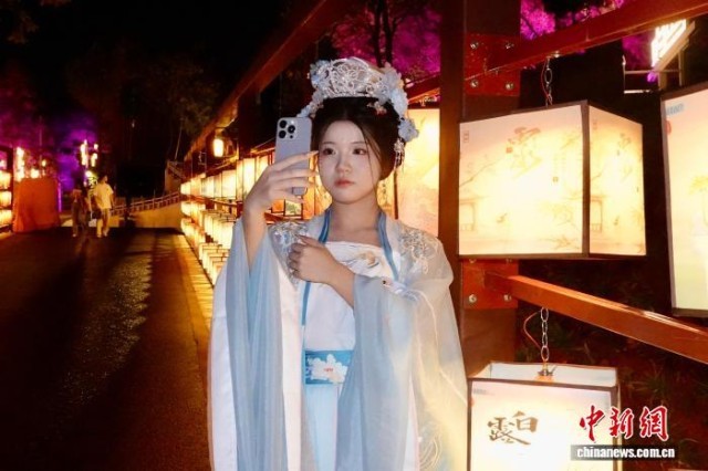 9月26日晚,浙江義烏雞鳴閣在燈光映襯下流光溢彩,成為中外游客夜游義烏的熱門景點。圖為游客身著古裝游覽雞鳴閣。中新社記者 劉子琳 攝