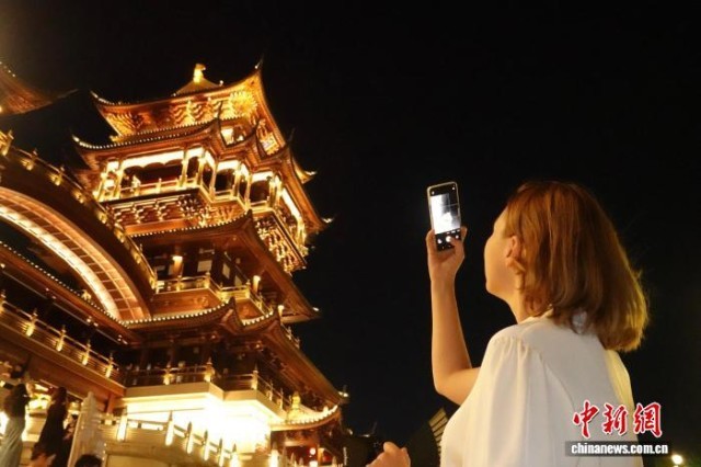 9月26日晚,浙江義烏雞鳴閣在燈光映襯下流光溢彩,成為中外游客夜游義烏的熱門景點。圖為外籍游客在雞鳴閣前自拍。中新社記者 劉子琳 攝