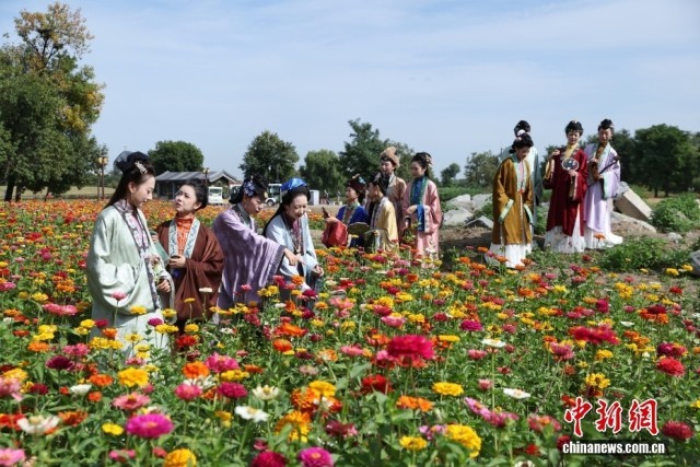 9月29日,北京,2025年圓明園金秋游開幕。金秋游期間,美麗的秋景與豐富多彩的文化活動,將讓游客在秋游的同時感受圓明園深厚的文化底蘊。圖為“十二美人”在花海中漫游,“十二美人”源自《清人畫胤禛妃行樂圖》,又名《十二美人圖》,原是圓明園“深柳讀書堂”圍屏上的裝飾畫。