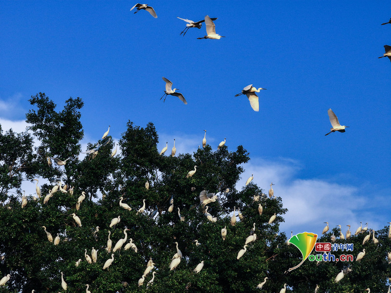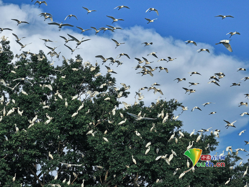 10月8日,廣西賀州,白鷺在昭平桂江國家濕地公園江邊的樹林小憩。寒露時節,正值候鳥遷徙季,數千只白鷺飛抵廣西昭平桂江國家濕地公園棲息,成群結對的白鷺在江邊竹林、小溪和濕地覓食飛舞,構成一幅靈動美麗的自然生態畫卷。
