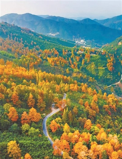 這里樹木叢生,道路多掩映于林間,顯得格外幽靜,而山峰被彩林環繞,若隱若現間仿佛觸手可及。尤其是秋雨之后,隨著霧氣的彌漫,光線若明若暗,為這片彩林增添了幾分悠然與神秘之感,令人陶醉在這層層疊疊的美景之中。
