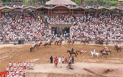 游客在萬歲山武俠城觀看實景演出《三打祝家莊》。