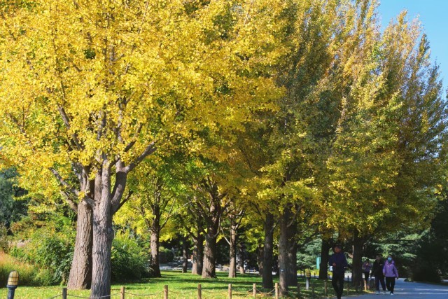 在絢秋苑內,白蠟、銀杏、欒樹、元寶槭等交相輝映,在陽光的映照下,散發出熠熠光輝。這些高大喬木將人們環抱于溫暖的秋色之中,置身于此,身心豁然開朗,仿佛步入遠離塵囂的世外桃源。櫸樹的葉片在秋風中漸漸轉為褐紅色,與銀杏的金黃形成鮮明對比。人們或駐足拍照,或靜靜凝望,心隨景動、情由境生,無不沉醉于這濃郁的秋意中。