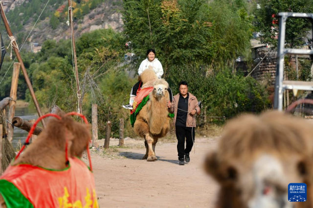 在山西省呂梁市臨縣磧口古鎮,一位游客在騎駱駝(10月30日攝)。