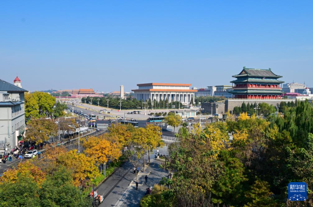 11月3日拍攝的北京正陽門城樓和正陽門箭樓及周邊的秋色。