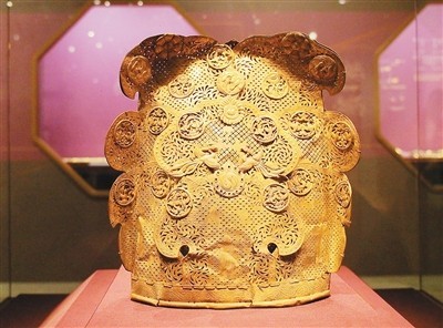 遼代雙鳳戲珠紋卷云冠由16片形狀如云朵的鏤空金屬片連綴拼合而成,上面還有22枚鎏金圓片,飾有菊花、鸚鵡、雁、飛鳥、太極圖案,其紋飾具有典型的中原文化元素。