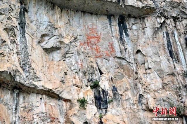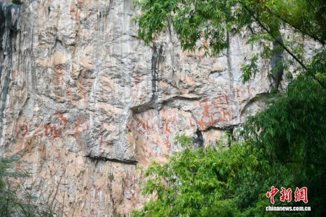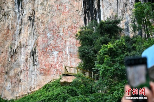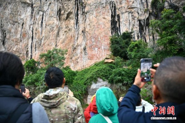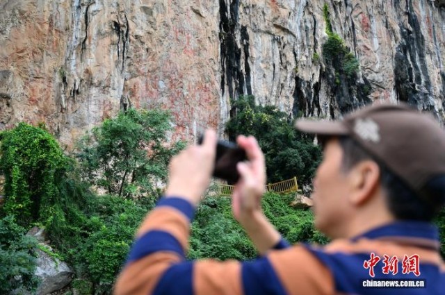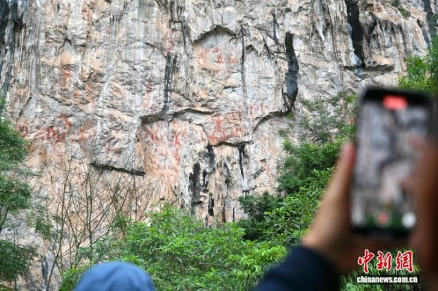 11月5日,地處中越邊境的廣西崇左寧明縣,游人乘船觀看花山巖畫?;ㄉ綆r畫由壯族先民古駱越人在巖壁上繪制,以造型各異的赭紅色圖像展現人物以及銅鼓等圖像,極富視覺沖擊力。寧明花山巖畫是左江流域巖畫群中圖像最多、內容最豐富、保存最完好的一處巖畫,被冠以整個左江巖畫群的代表。近年來,相關部門開展巖體搶險加固、搶險排危項目保護多個巖畫點。圖為游人拍攝花山巖畫。俞靖 攝